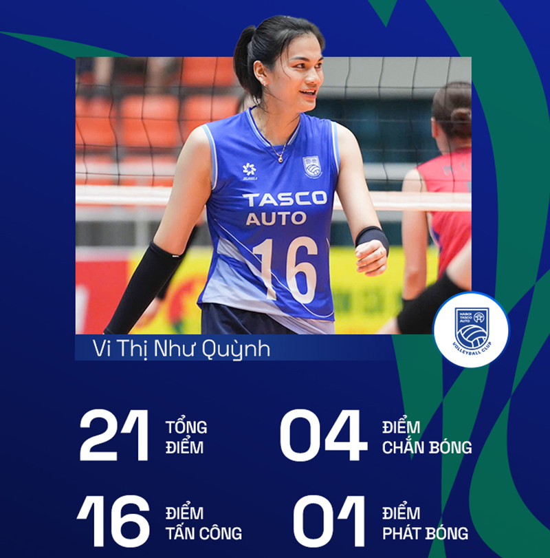 Nổi bật nhất vẫn là màn trình diễn của chủ công Vi Thị Như Quỳnh. Tay đập người Nghệ An tiếp tục phong độ ấn tượng khi ghi tới 21 điểm, trong đó có 4 điểm chắn bóng. Không chỉ sắc bén trong tấn công, cô còn cho thấy sự tiến bộ rõ rệt ở khâu phòng ngự khi nhiều lần hóa giải thành công các tình huống đánh nhanh phía sau đầu của đối phương.