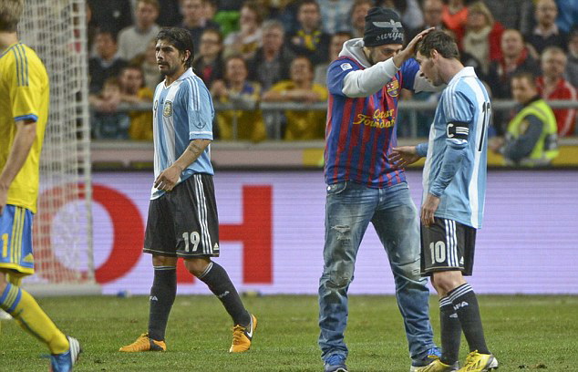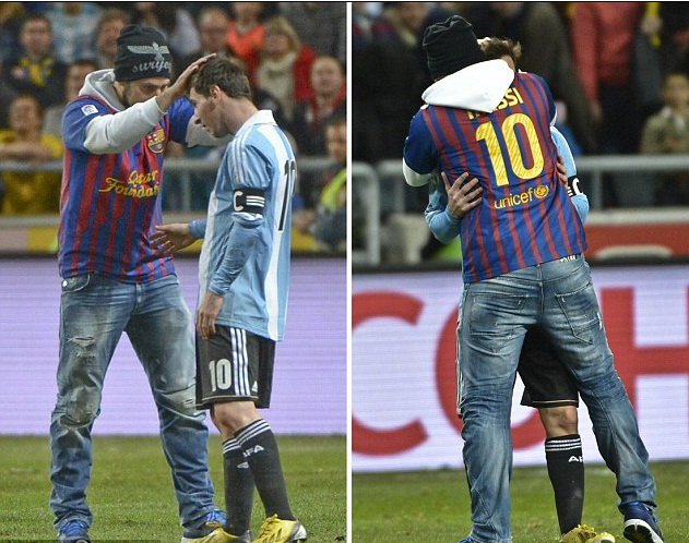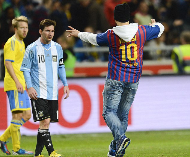 Ở trận giao hữu giữa Argentina với chủ nhà Thụy Điển trên SVĐ Nya Ullevi tại Gothenburg đêm qua, Messi lại trở thành đối tượng để một fan cuồng “tấn công”. Nhưng may cho siêu sao của Barca này là CĐV nói trên chỉ lao vào sân để thể hiện sự yêu mến với Messi.