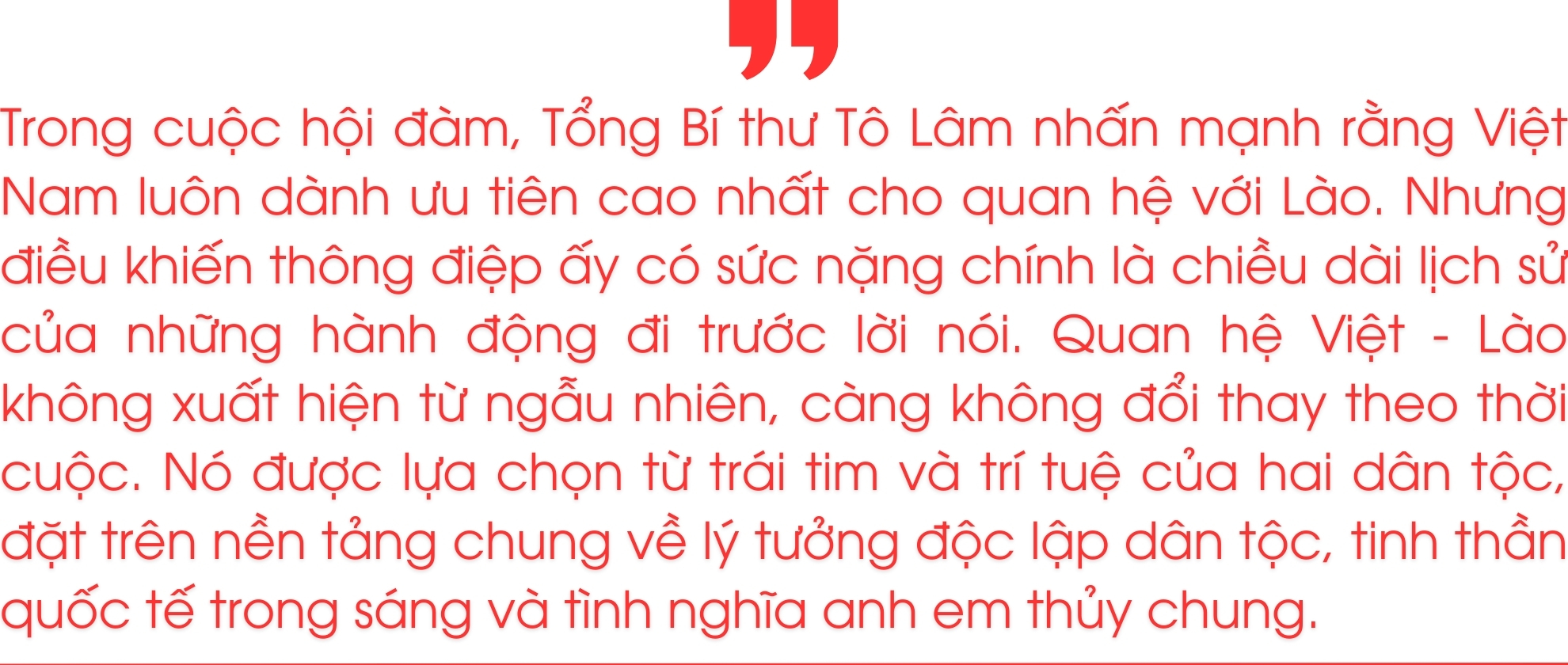 Trong cuộc hội đàm, Tổng Bí thư Tô Lâm nhấn mạnh rằng Việt Nam luôn dành ưu tiên cao nhất cho quan hệ với Lào. Nhưng điều khiến thông điệp ấy có sức nặng chính là chiều dài lịch sử của những hành động đi trước lời nói. Quan hệ Việt - Lào không xuất hiện từ ngẫu nhiên, càng không đổi thay theo thời cuộc. Nó được lựa chọn từ trái tim và trí tuệ của hai dân tộc, đặt trên nền tảng chung về lý tưởng độc lập dân tộc, tinh thần quốc tế trong sáng và tình nghĩa anh em thủy chung.