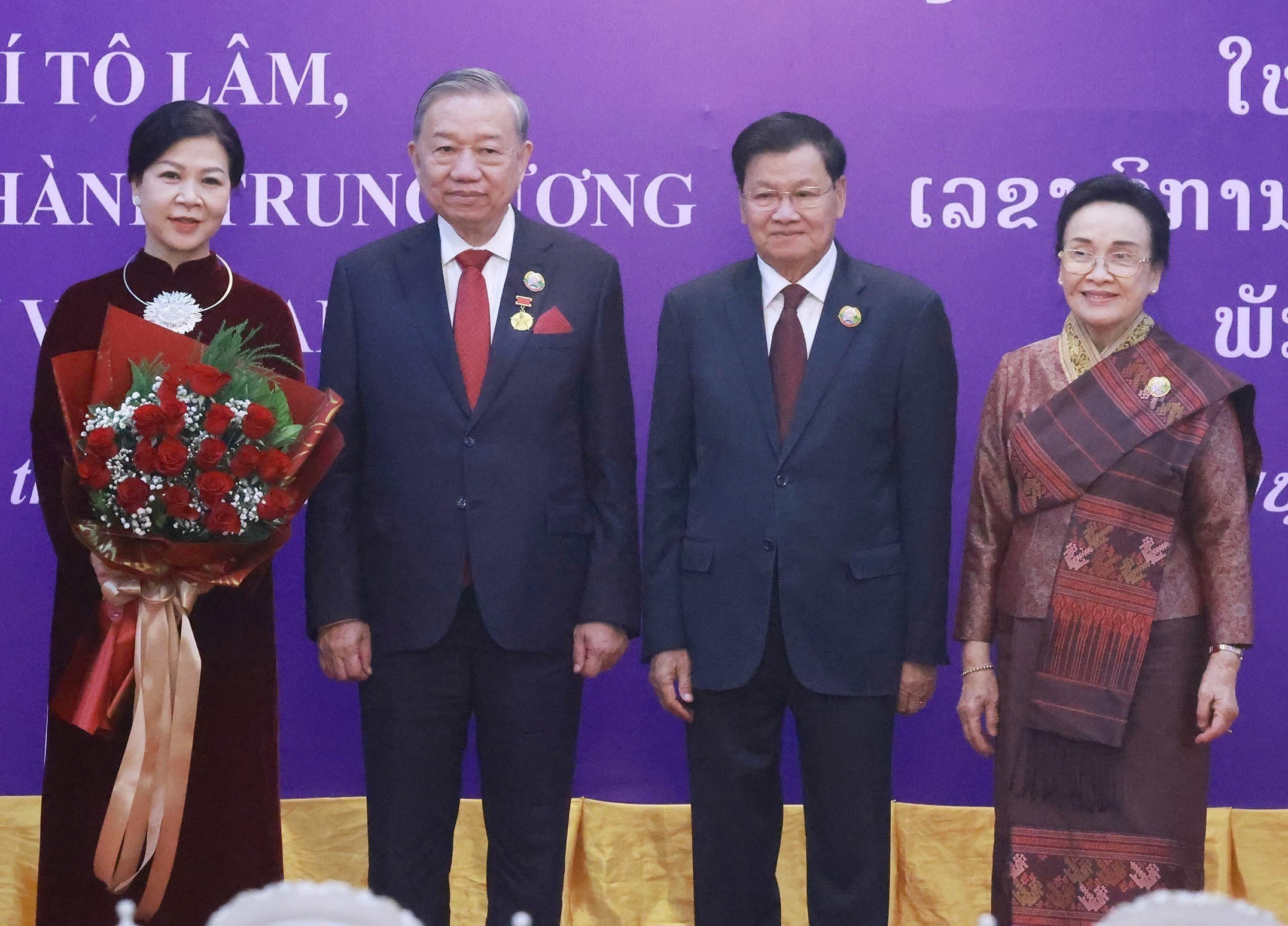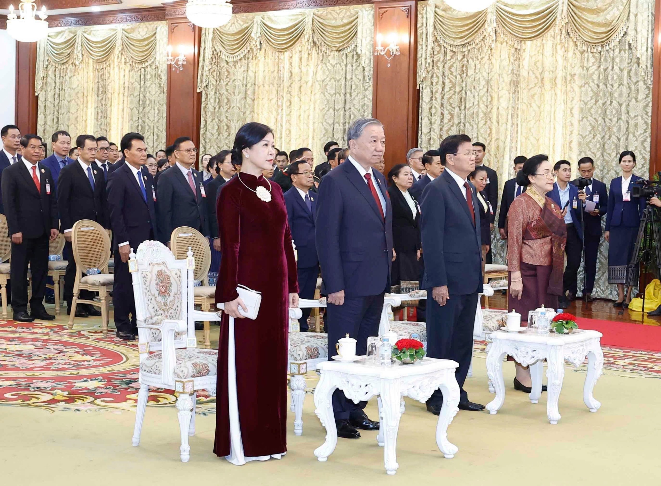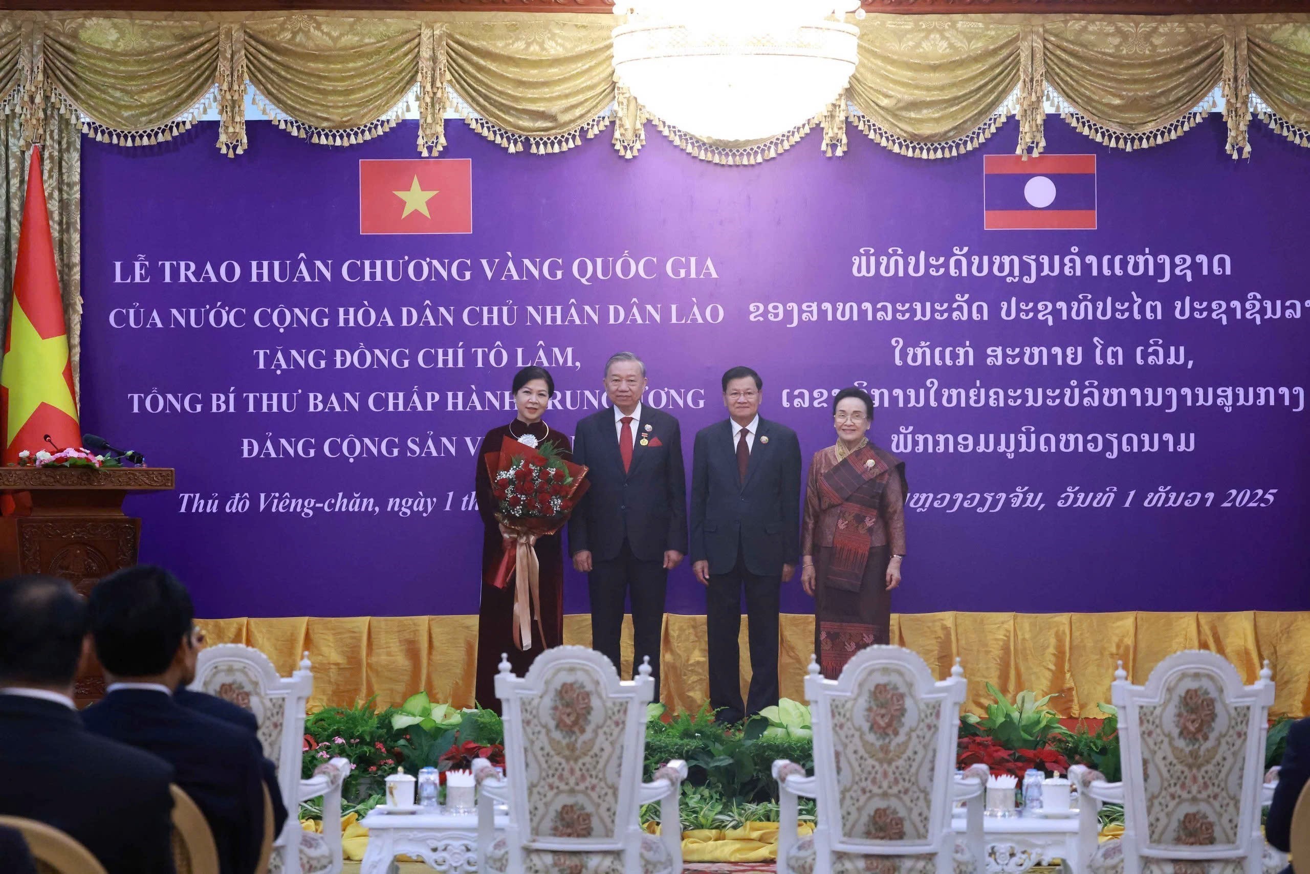 Tổng Bí thư Tô Lâm và Phu nhân, Tổng Bí thư, Chủ tịch nước Lào Thongloun Sisoulith và Phu nhân cùng đại biểu hai nước tham dự buổi lễ trao tặng Huân chương Vàng Quốc gia của Lào cho Tổng Bí thư Tô Lâm sáng ngày 1/12/2025