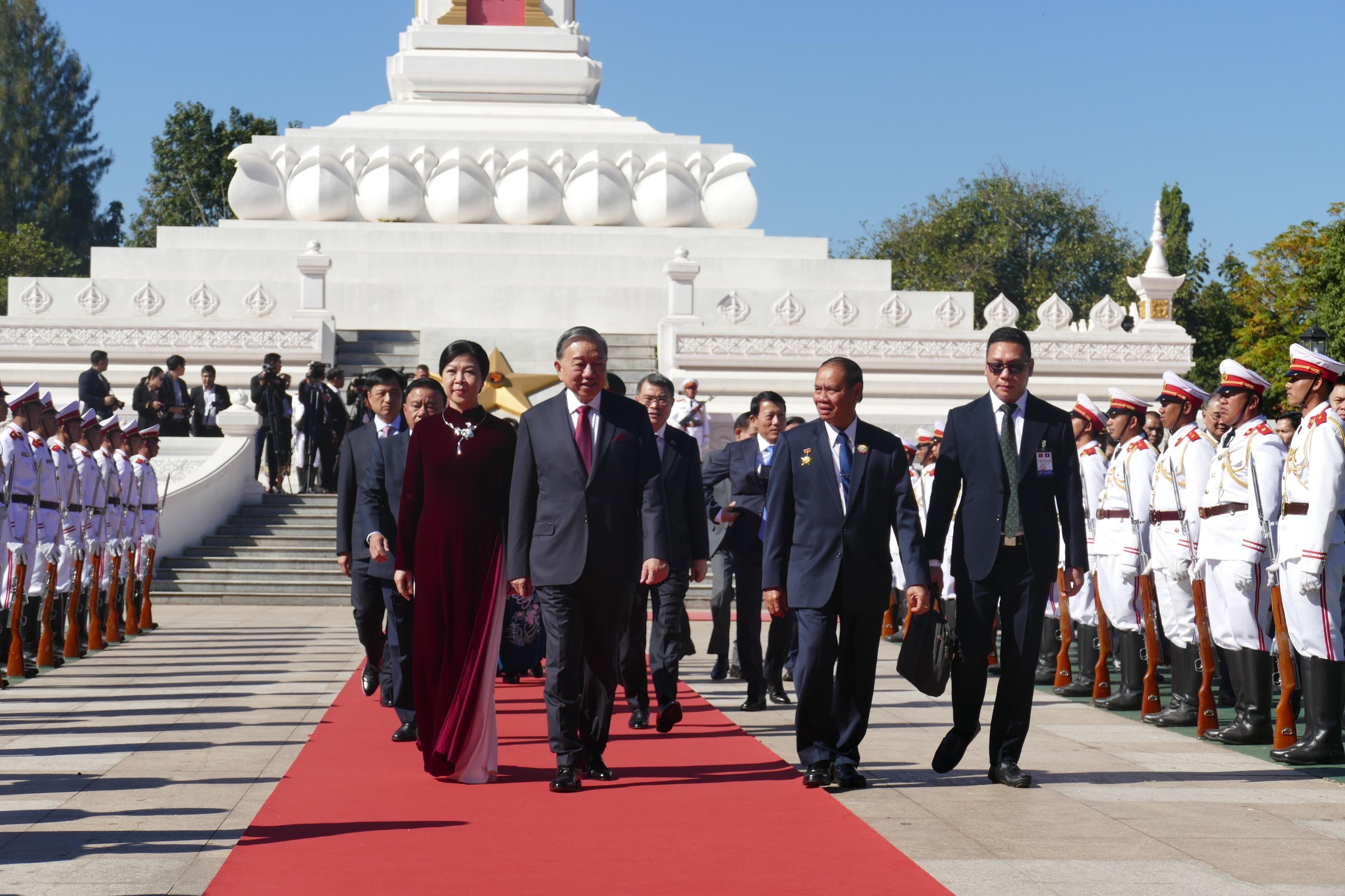 Tổng Bí thư Tô Lâm và Phu nhân cùng Đoàn đại biểu cấp cao Việt Nam đến đặt vòng hoa tại Đài tưởng niệm các chiến sĩ vô danh của Lào ở thủ đô Vientiane