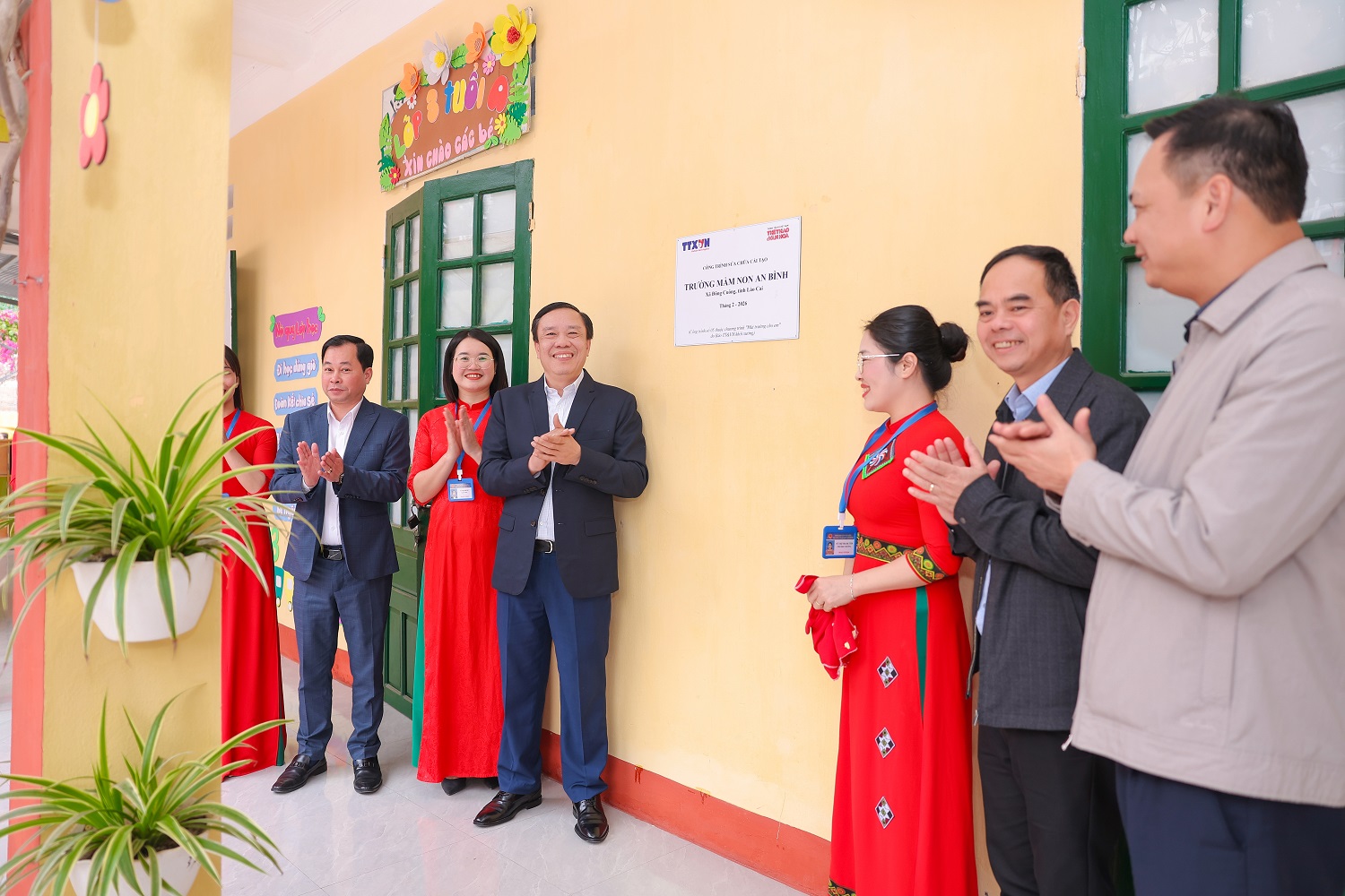 Nhà báo Nguyễn Thiện Thuật cùng đại diện lãnh đạo xã và Trường Mầm non An Bình mở băng khánh thành công trình sửa chữa, cải tạo Trường Mầm non An Bình