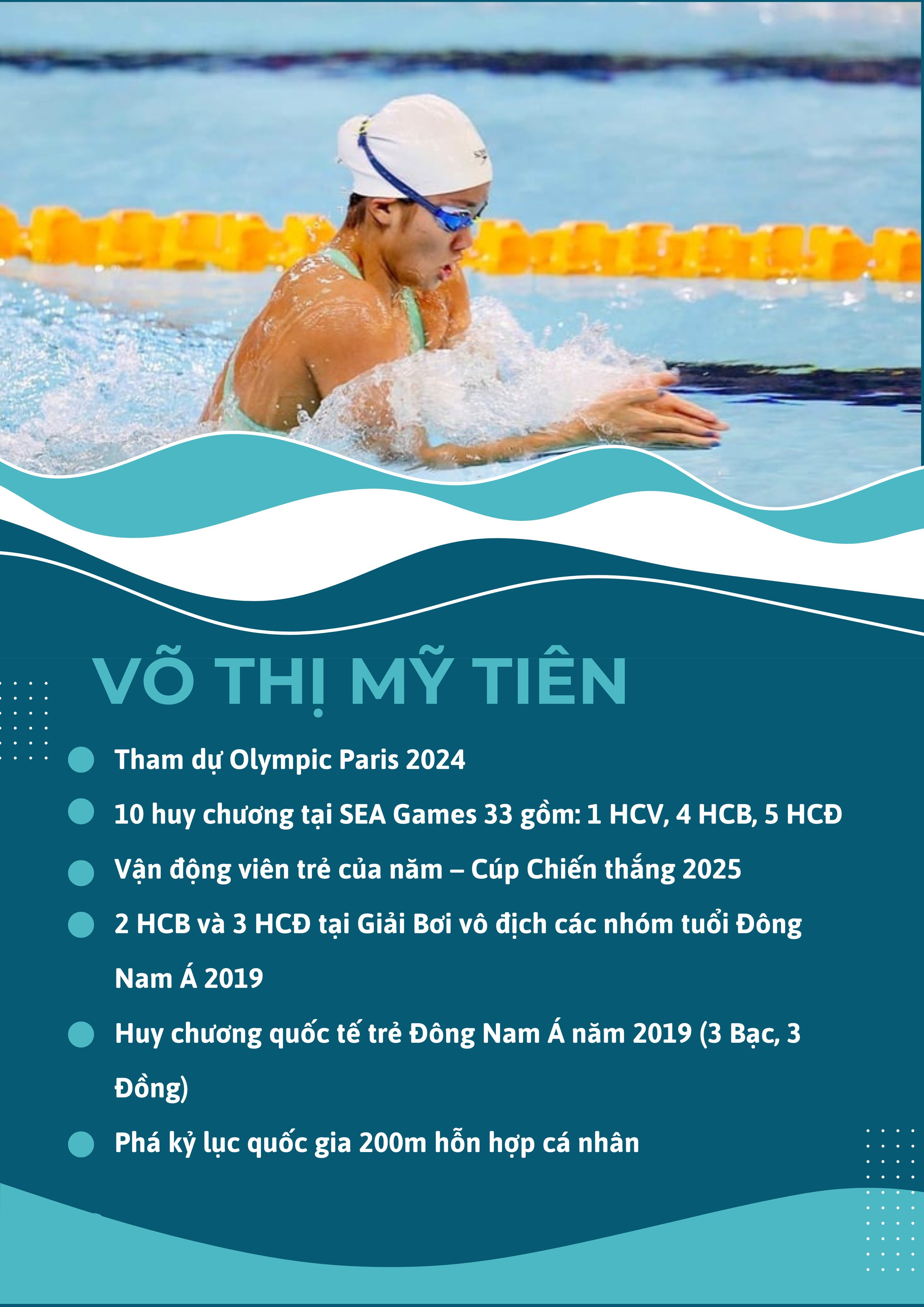 3. Võ Thị Mỹ Tiên (Sinh năm: 2005; Môn: Bơi) - Thành tích nổi bật: Giành 1 HCV (nội dung tiếp sức), 3 HCB, 5 HCĐ SEA Games 33; Giành 2 HCB, 3 HCĐ Giải vô địch châu Á 2025; Giành 2 HCV Giải vô địch Đông Nam Á mặt nước mở 2025.