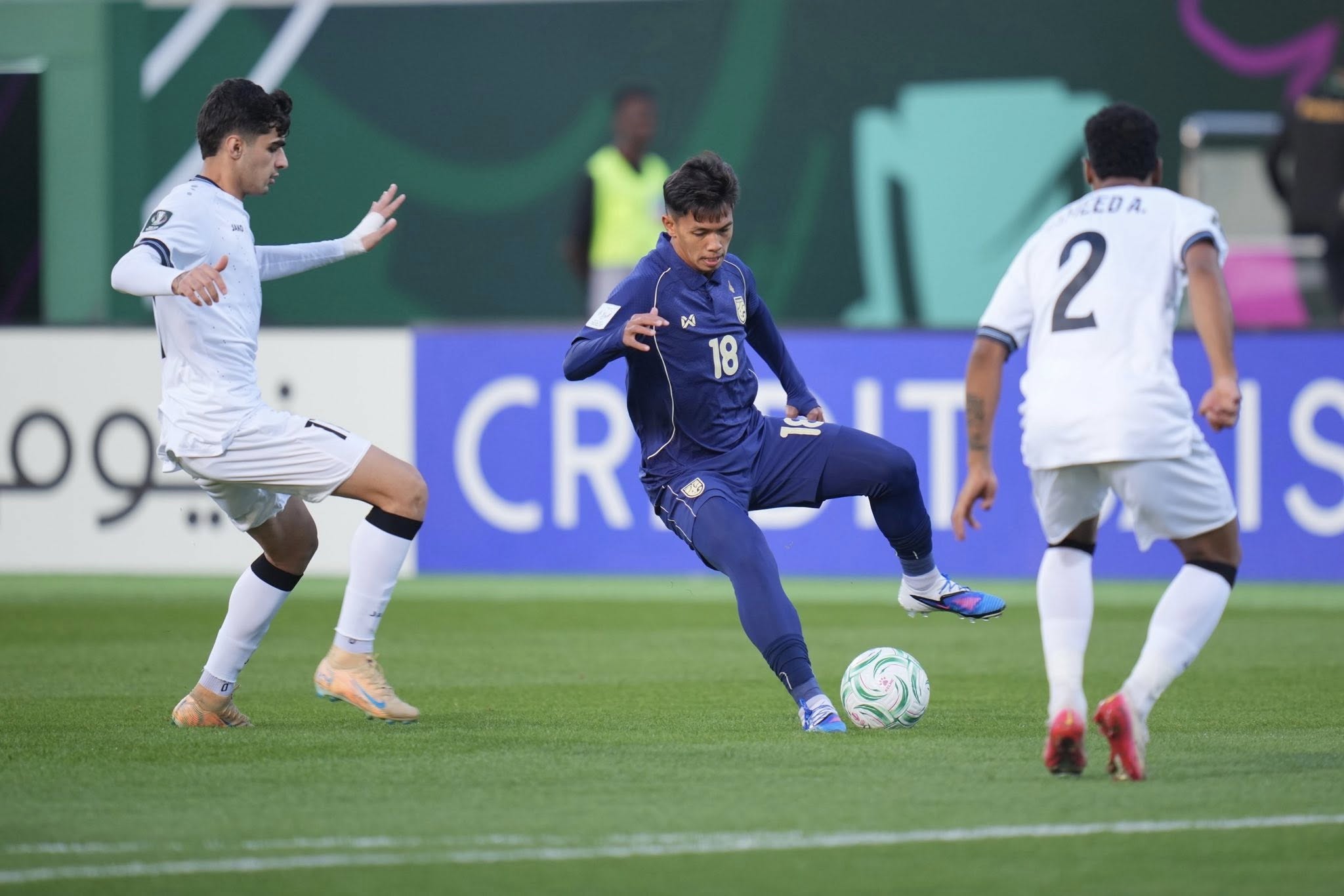 Phút 58: KHÔNG VÀO! U23 Thái Lan có pha phản công nguy hiểm, đáng tiếc rằng pha ra chân cuối cùng đã bị chặn lại bởi hàng thủ U23 Iraq.