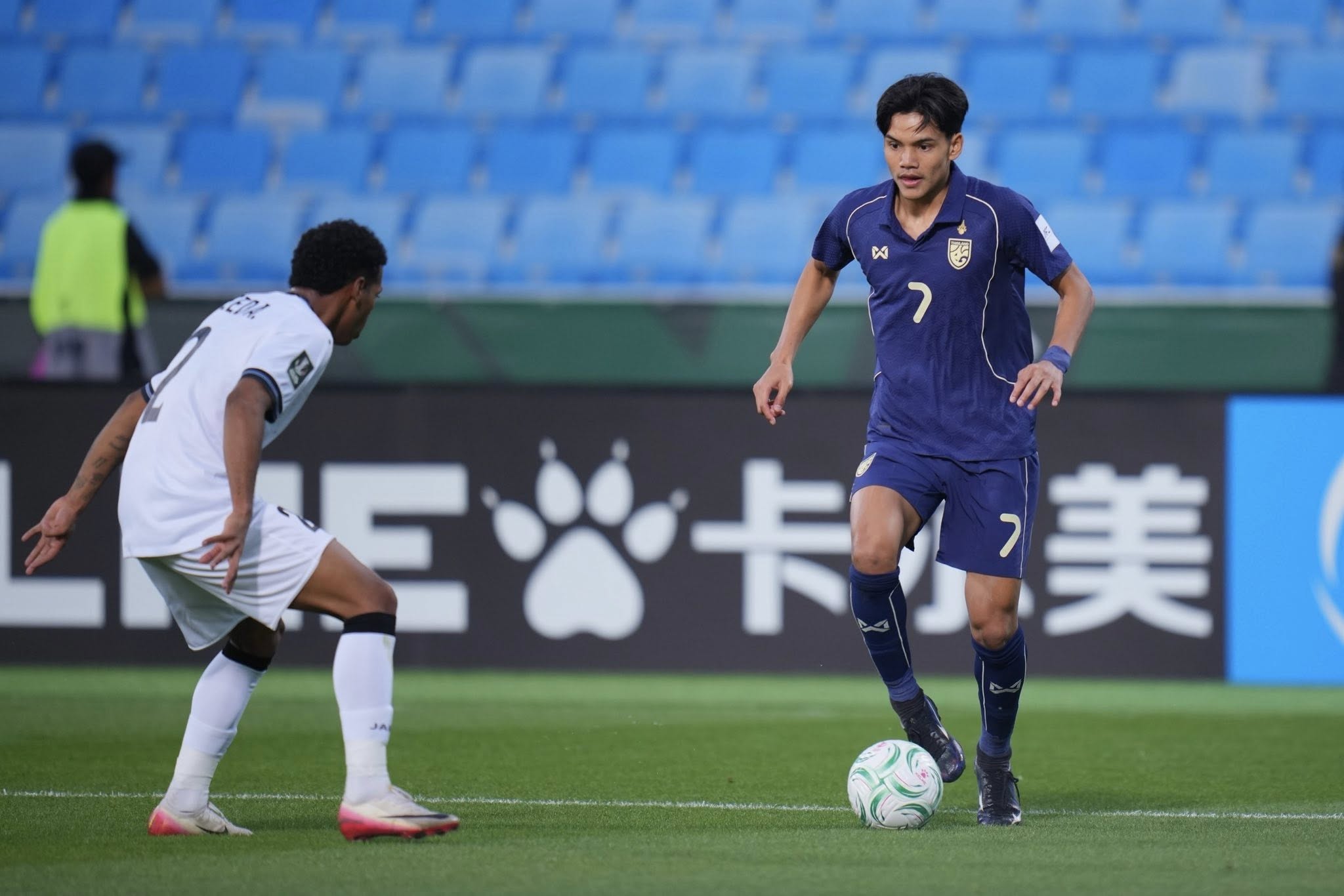 Phút 4: KHÔNG VÀO! Teerapat thực hiện tình đá phạt ngoài vòng cấm, đáng tiếc rằng bóng đã không đi trúng đích.
