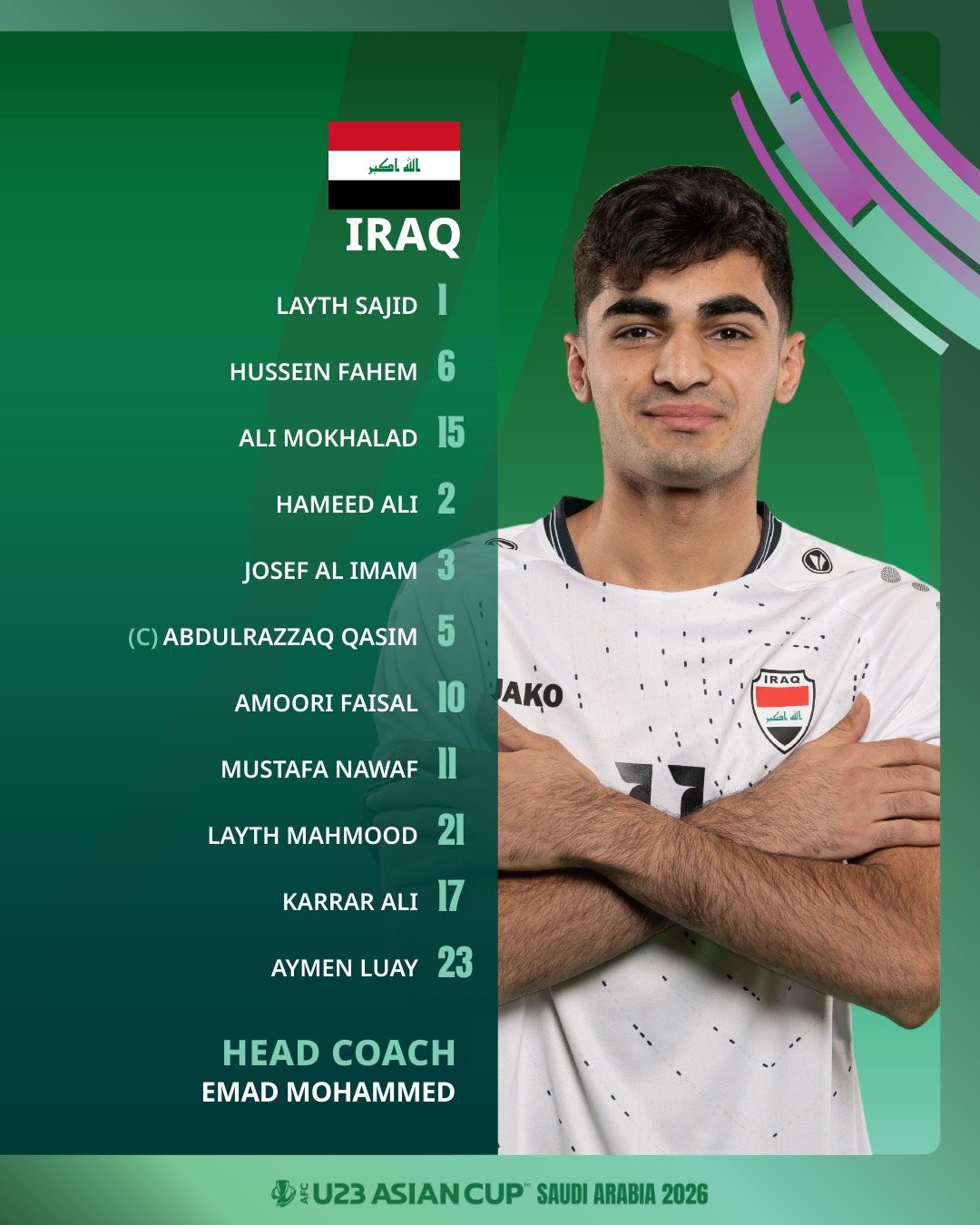 U23 Iraq: Layth, Karrar, Josef, Abbas, Hussein, Abbas, Abdulrazzaq, Mokhalad, Sadeq, Aymen, Mohammed.