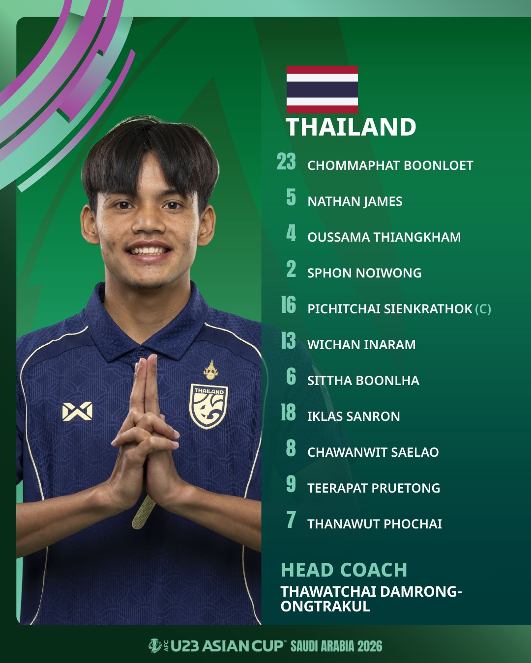 U23 Thái Lan: Chommaphat, Ossama, Nathan, Sphon, Pichitchai, Iklas, Wichan, Sittha, Peeranan, Thanawut, Chawanwit.