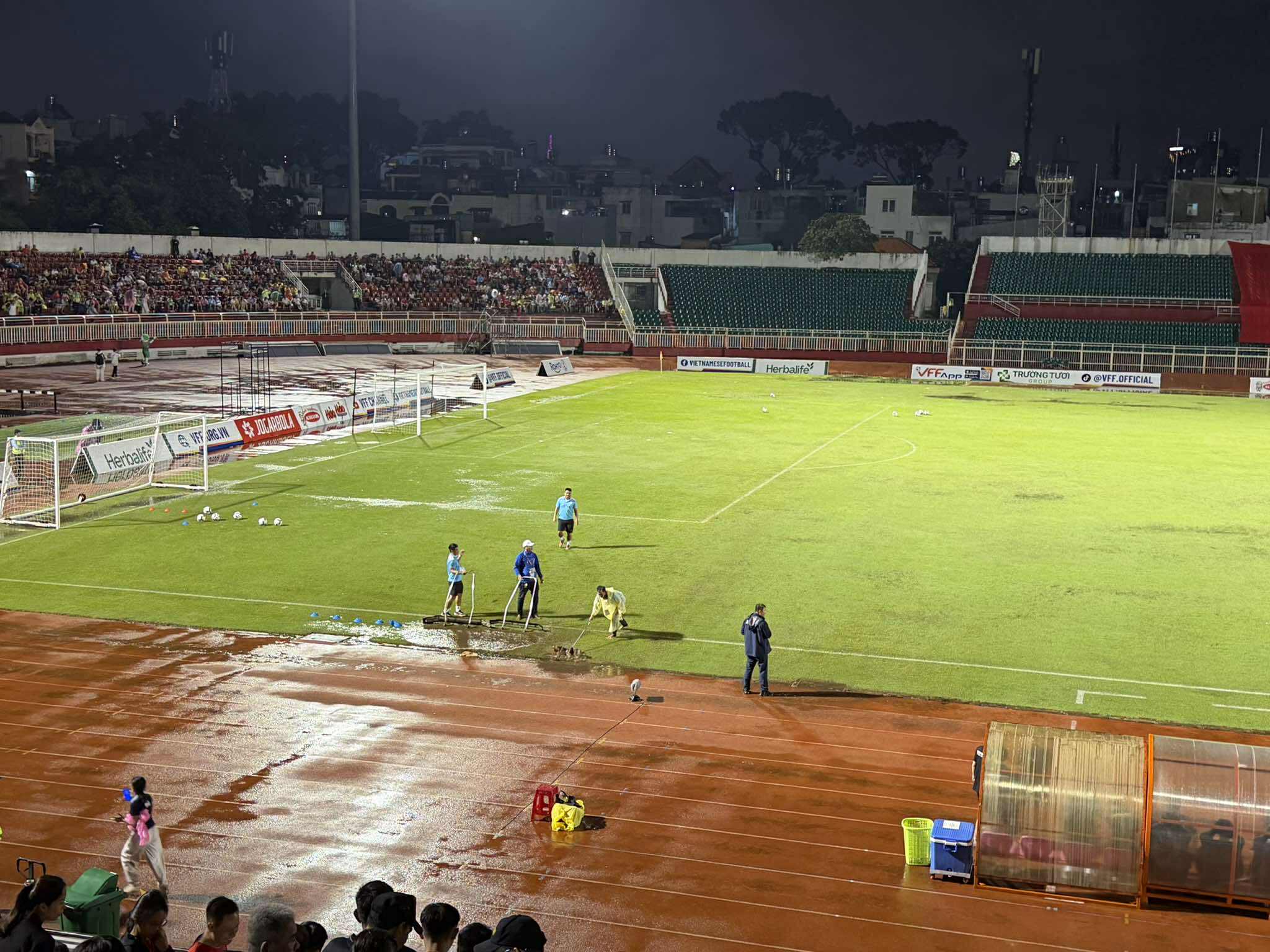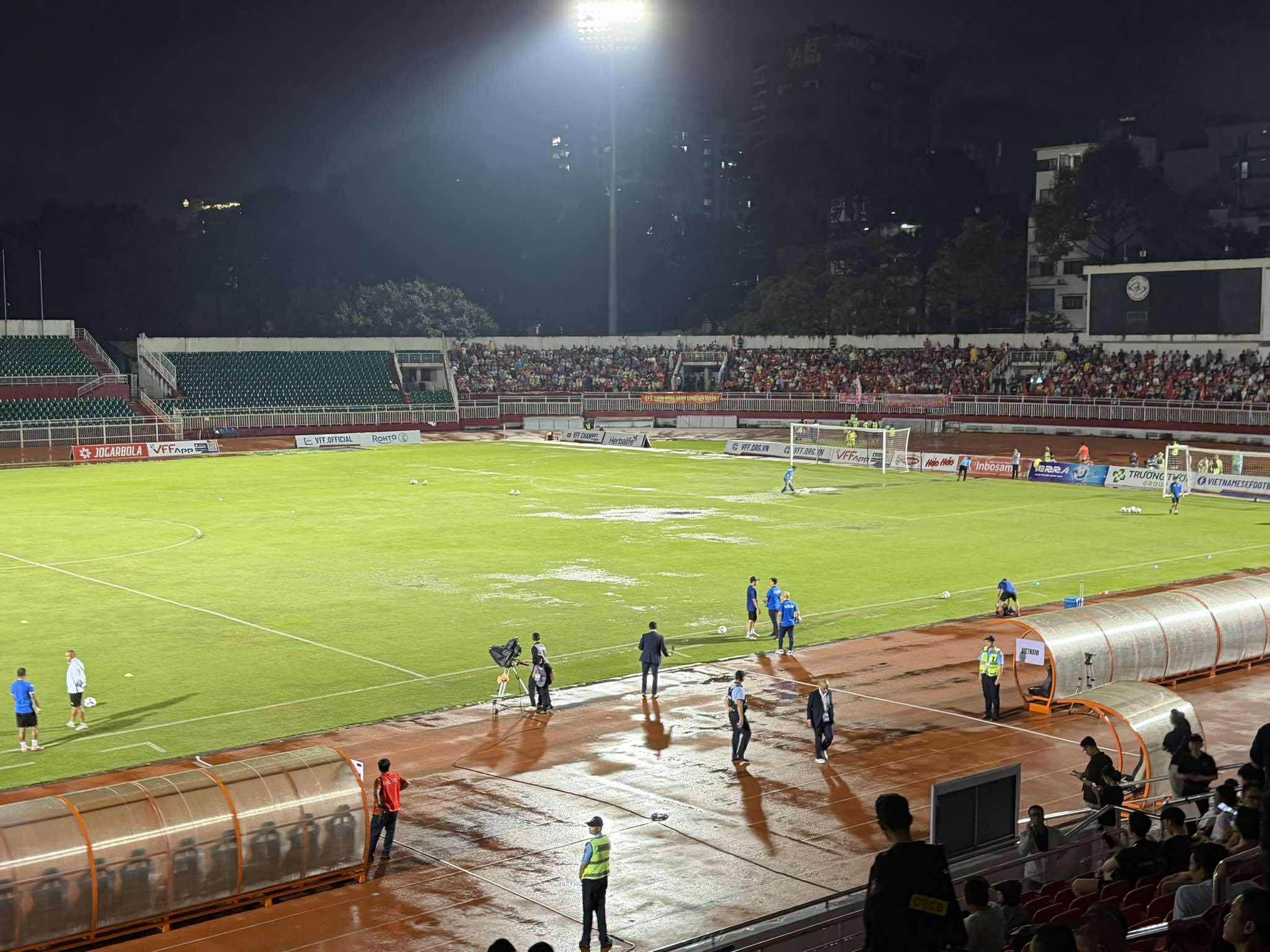 +Do thời tiết có mưa to, trận đấu bị lùi 30 phút. Như vậy, trận đấu sẽ bắt đầu lúc 20h00 tối nay. Ảnh: Minh Tiến