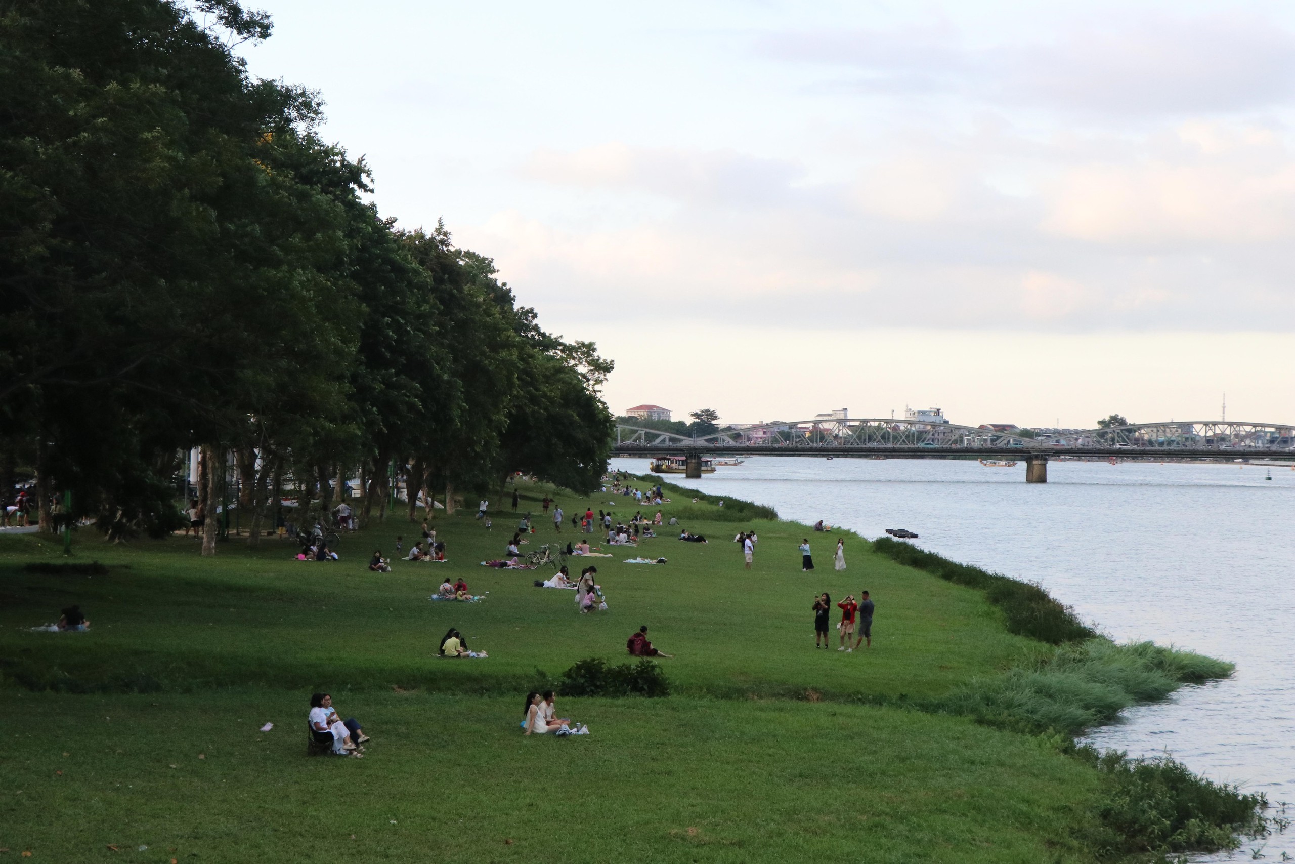 Không gian xanh với bãi cỏ và cây xanh ven bờ sông Hương, thành phố Huế luôn là điểm thu hút đông đảo du khách vào mỗi buổi chiều. Ảnh tư liệu: Nguyên Lý - TTXVN
