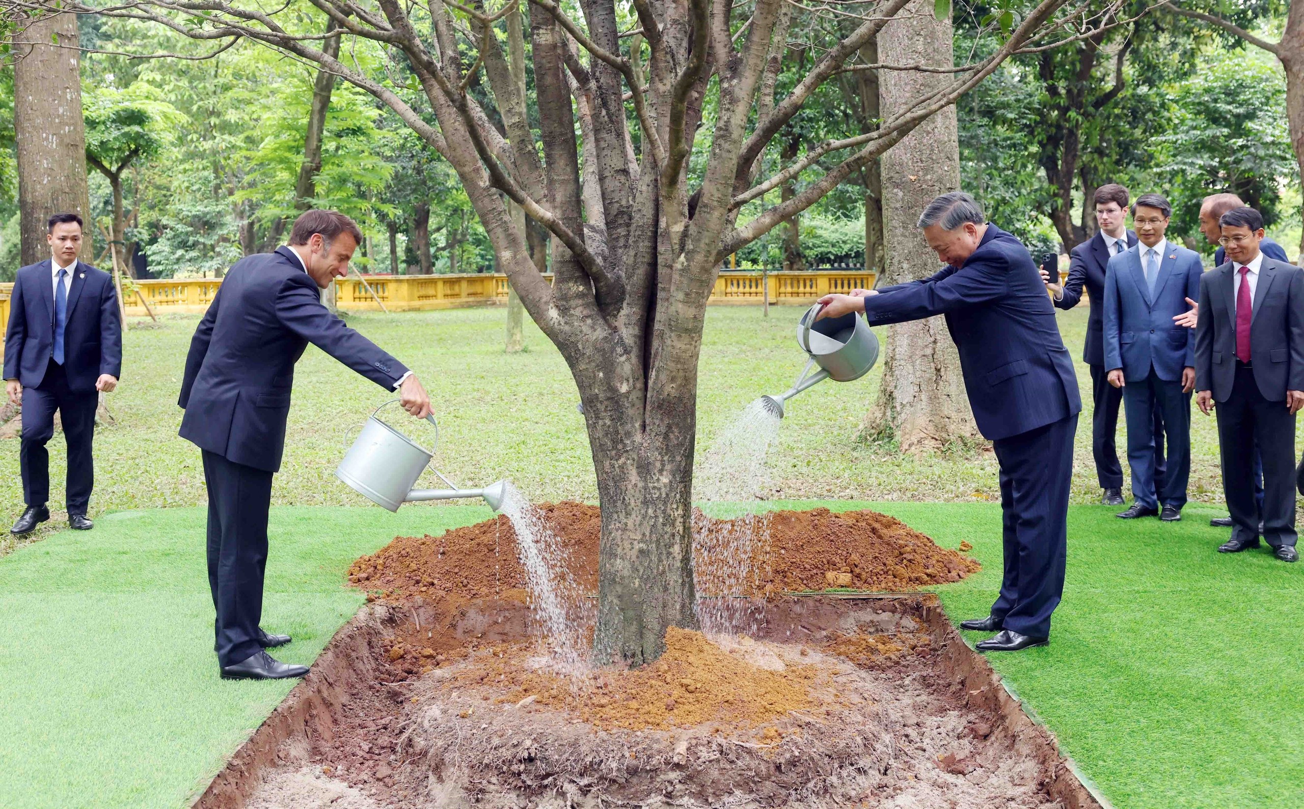 Tổng Bí thư Tô Lâm và Tổng thống Pháp Emmanuel Macron trồng cây hữu nghị trong Khu di tích Chủ tịch Hồ Chí Minh tại Phủ Chủ tịch ngày 26/5/2025. Ảnh: Phạm Kiên - TTXVN