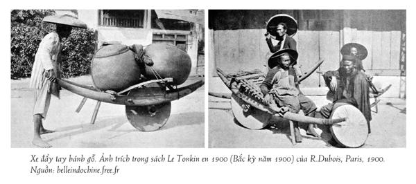 Trong cuốn sách Le Tonkin En 1900 (Bắc Kỳ năm 1900) của R.Ruboi (Paris, 1900) có chụp vài ảnh về nông dân Bắc Bộ vận chuyển hàng bằng xe đẩy một bánh. Người ta đặt một mặt sàn tre gỗ vào hai càng, nên có thể chất nhiều hàng, thậm chí là hai bồ đựng lớn. Dưới càng gần người đẩy có hai chân chống, khi nghỉ, dựng xe tại chỗ, xe vẫn đứng được. Chiếc xe bánh đẩy này cũng được vẽ lại trong cuốn Kỹ thuật của người An Nam, của Henri Oger. Người Trung Quốc khi dùng xe bánh đẩy có một cải tiến khá kỳ lạ tức là gắn một cột và cánh buồm vào xe, nếu đi xuôi theo chiều gió, sẽ giúp đẩy xa đi nhanh hơn.