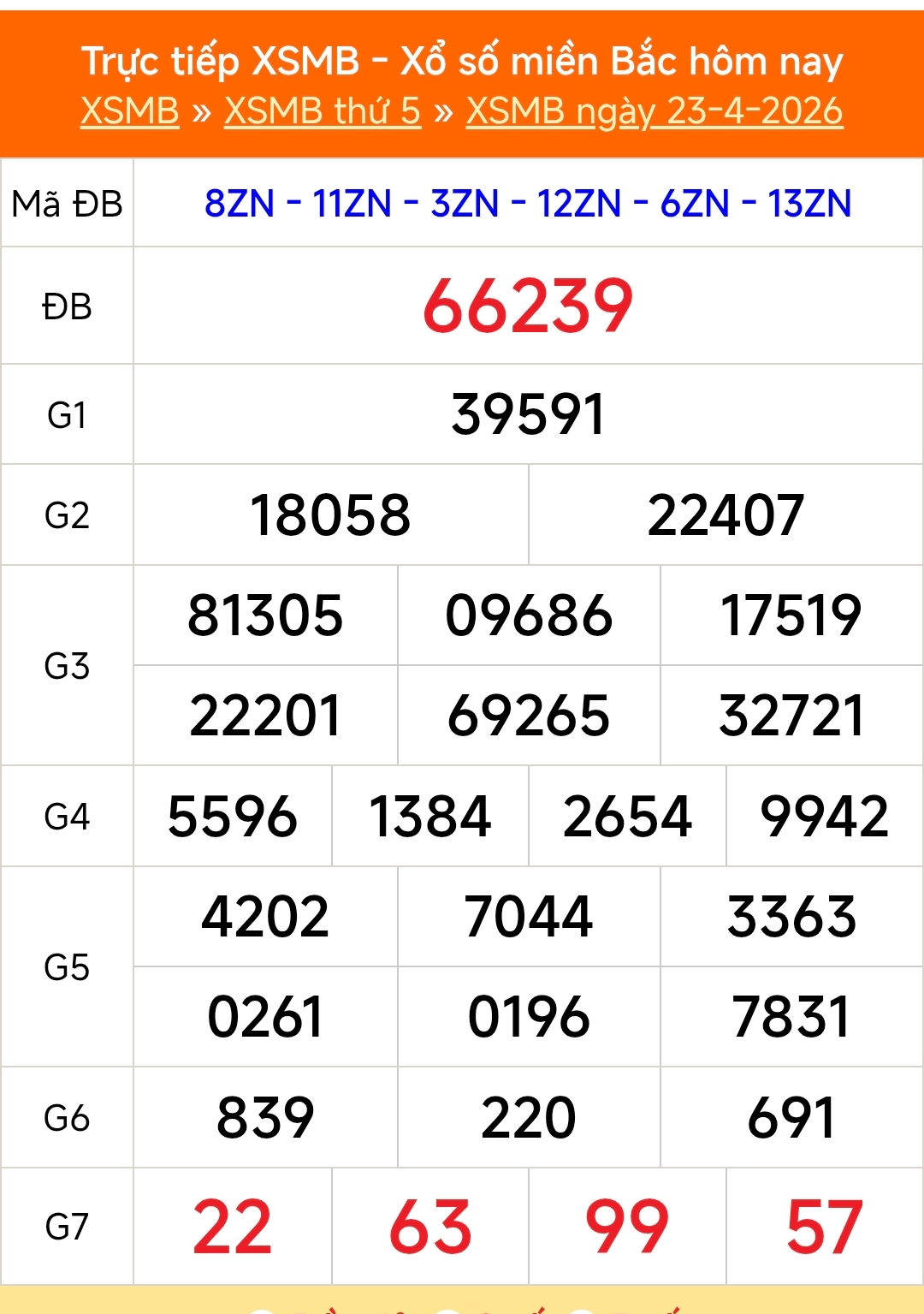 Kết quả Xổ số miền Bắc hôm nay ngày 23/4/2026