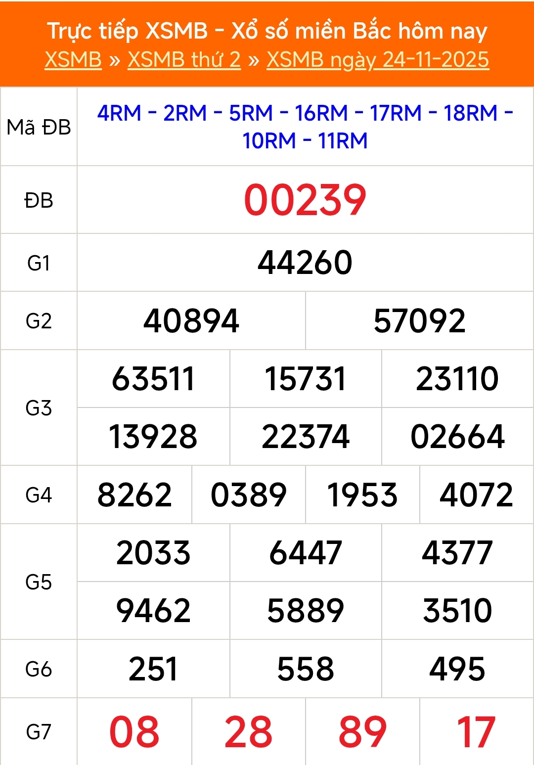 XSMB 24/11: Kết quả Xổ số miền Bắc hôm nay thứ Hai ngày 24/11/2025 quay thưởng lúc 18h10 được trực tiếp cập nhật nhanh nhất, chính xác nhất trên Thethaovanhoa.vn.