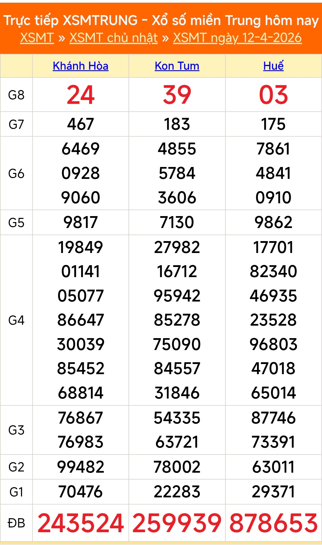 XSMT 12/4: Thethaovanhoa.vn cập nhật kết quả xổ số miền Trung Chủ Nhật ngày 12/4/2026 gồm các xổ số Khánh Hòa, Kon Tum và Huế.