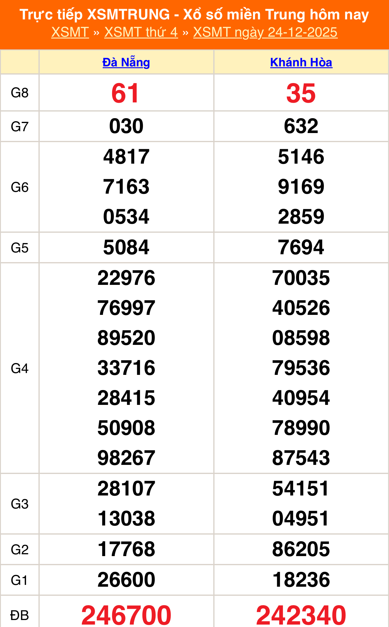 Kết quả xổ số miền Trung ngày 24/12/2025 được quay thưởng vào lúc 17h15, bởi Công ty xổ số kiến thiết: Khánh Hòa và Đà Nẵng. Kết quả các giải thưởng ngày 24/12/2025 sẽ được công bố lần lượt từ giải nhất cho đến giải tám, cuối cùng là giải đặc biệt.