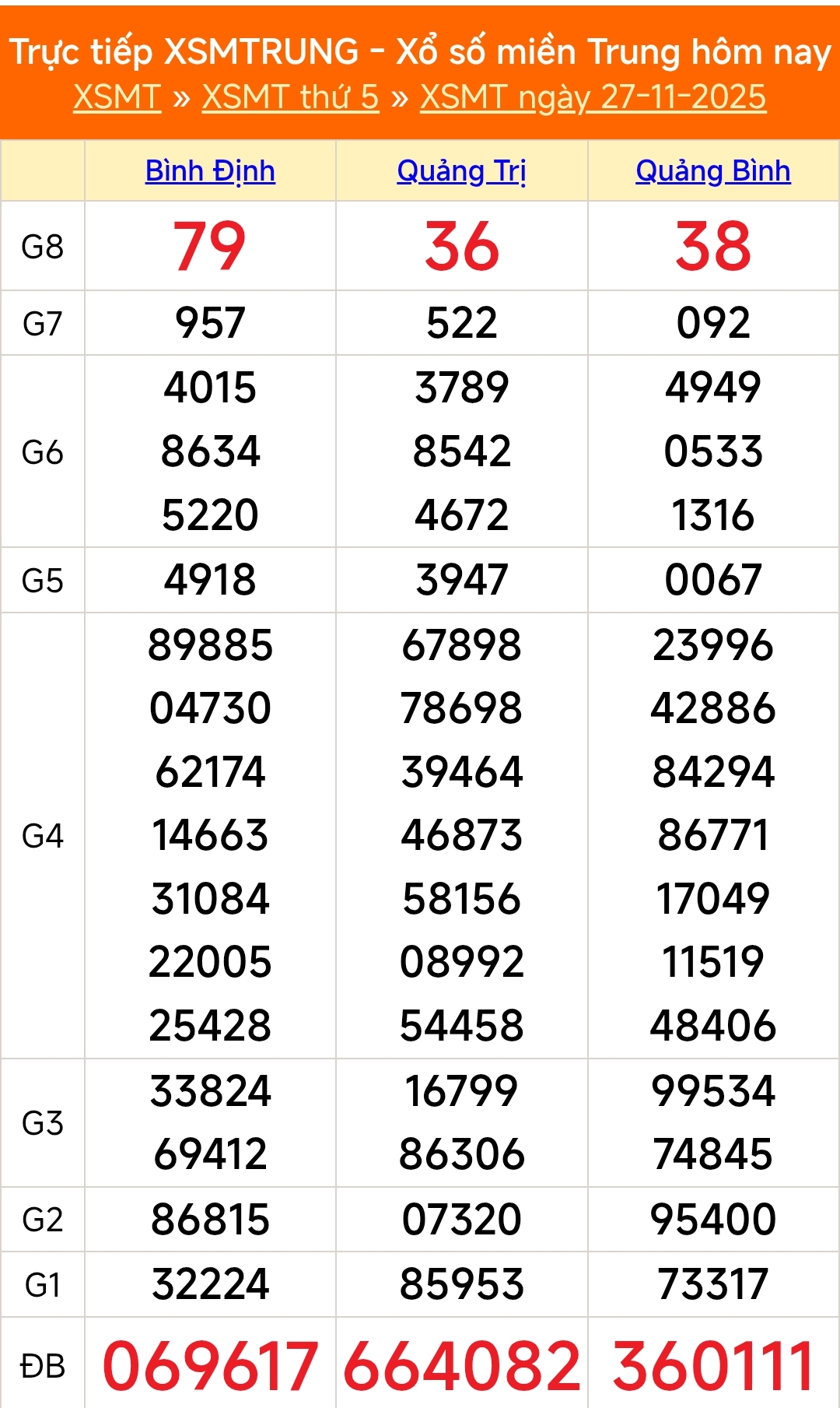 XSMT 27/11: Thethaovanhoa.vn cập nhật kết quả xổ số miền Trung ngày thứ Năm 27/11/2025 gồm các xổ số Bình Định, Quảng Trị và Quảng Bình.