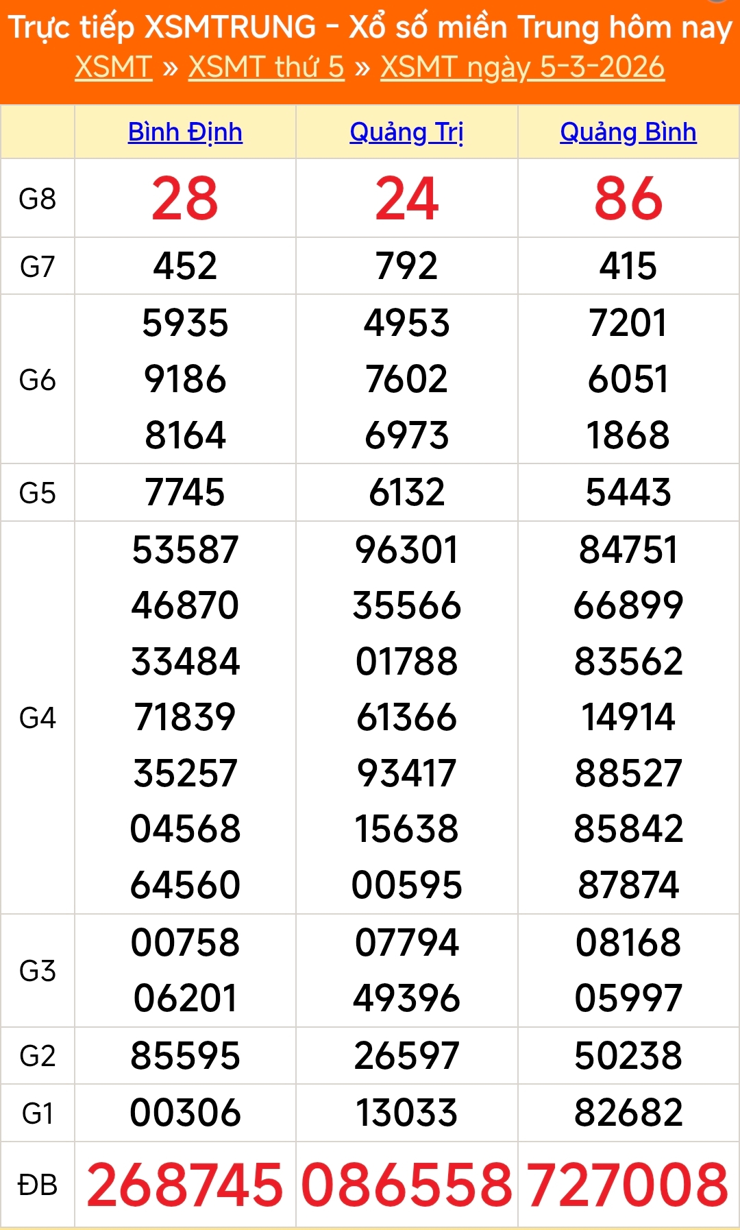 XSMT 5/3: Thethaovanhoa.vn cập nhật kết quả xổ số miền Trung hôm thứ Năm ngày 5/3/2026 gồm các xổ số Bình Định, Quảng Trị và Quảng Bình.
