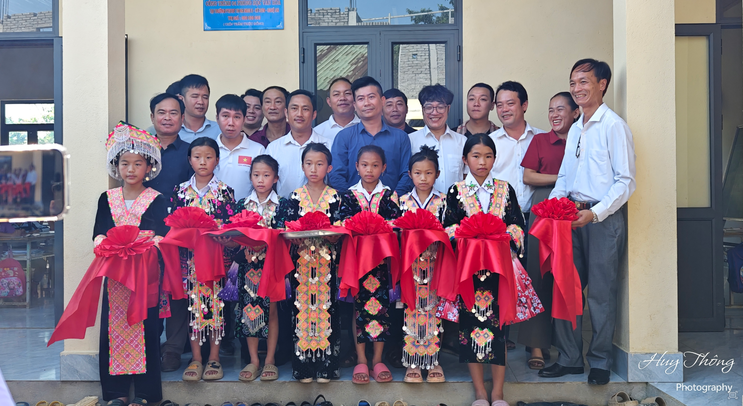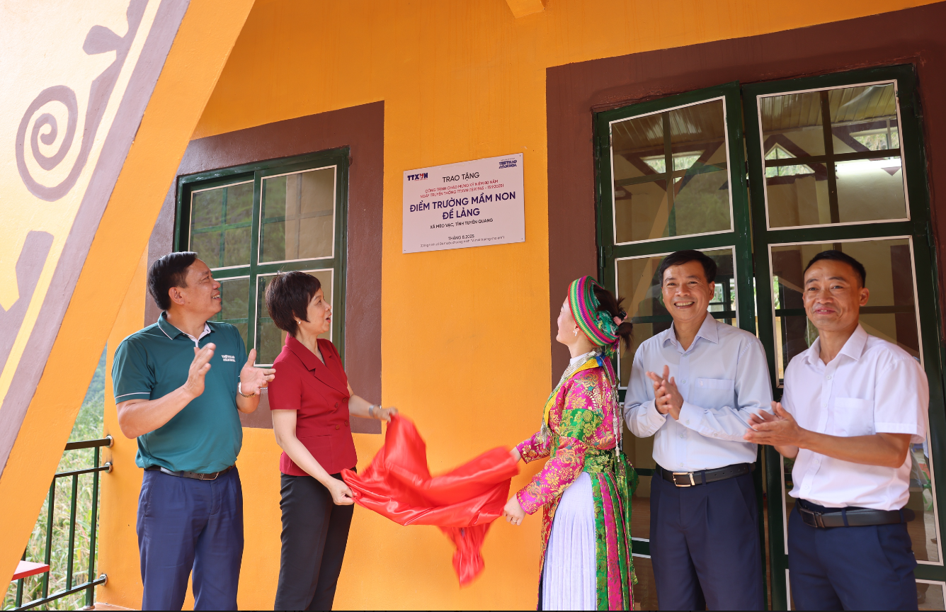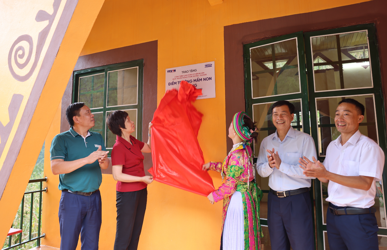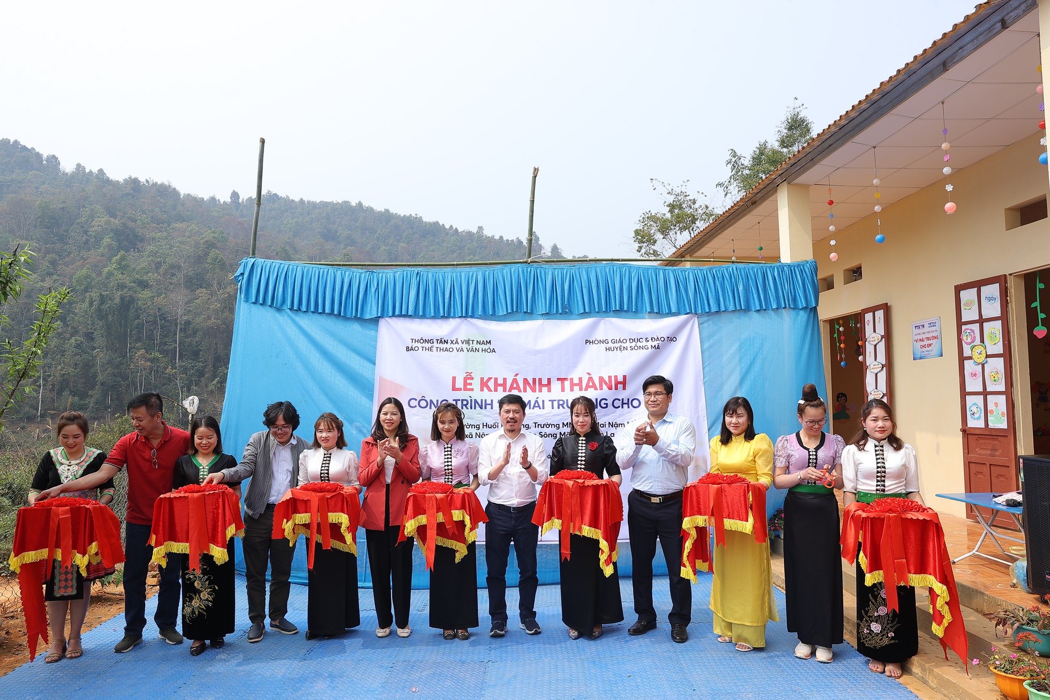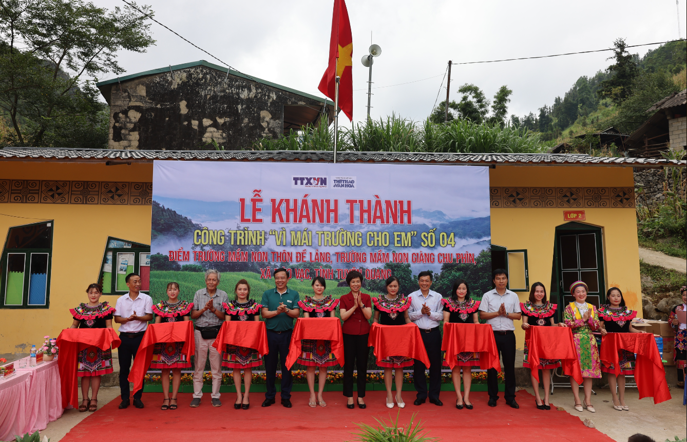 Nhà báo Vũ Việt Trang, Tổng Giám đốc TTXVN; nhà báo Nguyễn Thiện Thuật - Tổng biên tập Báo thể thao và Văn hóa cùng hiệu trưởng Trường Mầm non Giàng Chu Phìn, đại diện Sở GD&ĐT tỉnh Tuyên Quang, đại diện UBND xã Mèo Vạc cắt băng khánh thành và thực hiện nghi thức mở biển công trình
