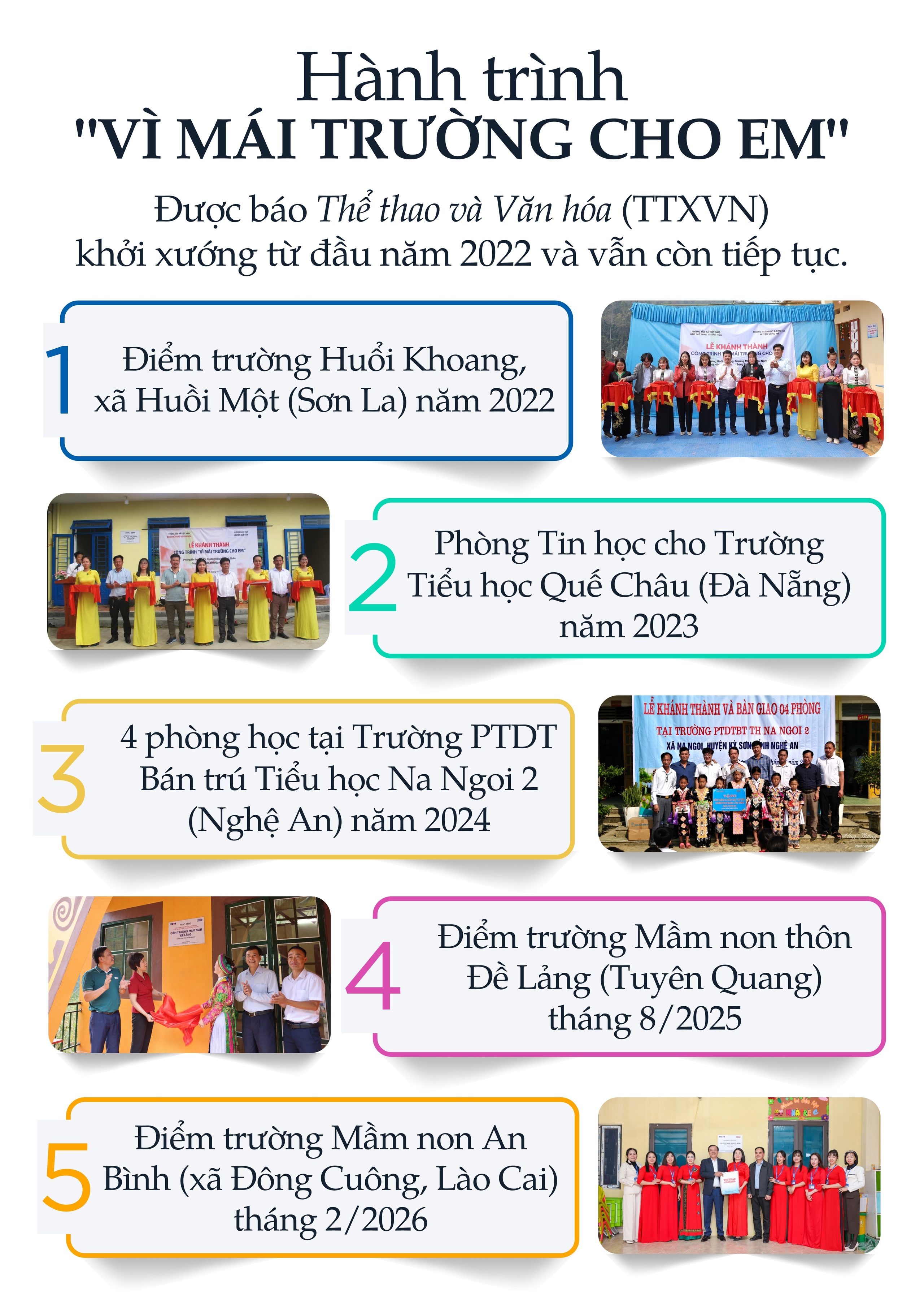 Tháng 2/2026, khi công trình thứ 5 của chương trình "Vì mái trường cho em" chính thức khánh thành tại Lào Cai, cũng là lúc những người làm báo Thể thao và Văn hóa (TTXVN) nhìn lại chặng đường gần 4 năm bền bỉ.