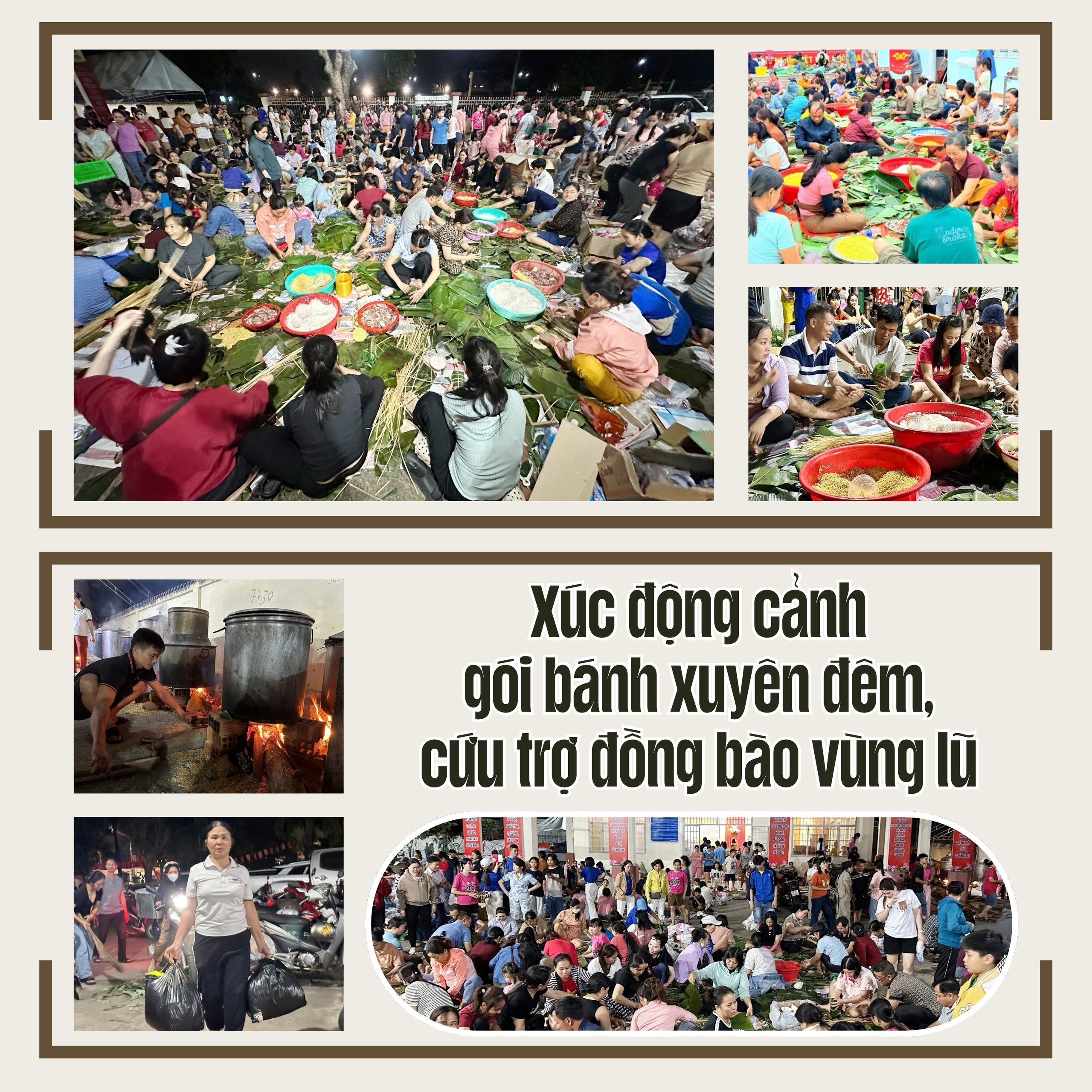 Trong đêm khuya, người dân vẫn tỉ mỉ gói từng cái bánh, gửi gắm tình yêu thương đồng bào để gửi đến bà còn đang phải gồng mình chống lũ